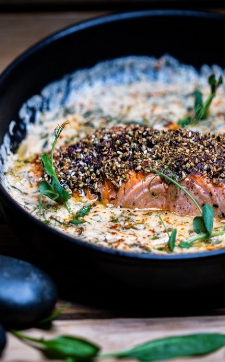 سلمون بالزعتر والسماق مع صوص الطحينة بالفيديو