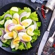 - في وعاء كبير، نضع البيض المسلوق مع الطماطم والخيار، ونخلط المكونات معاً.