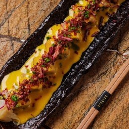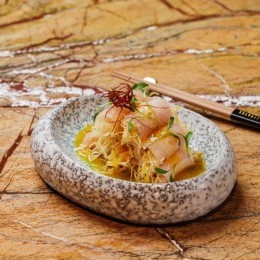 شرائح الهماتشي النيئة ... هذا الطبق هو نوع من الساشيمي أو سمك الهماتشي الياباني النيء مع صوص حمضي وتزيين فاخر.