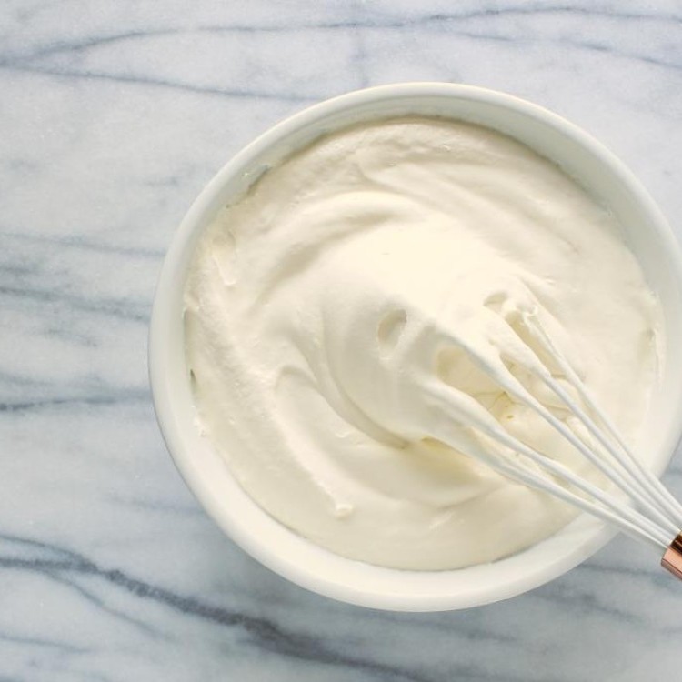 - اخفقي الكريمة في وعاء زجاجي أو معدني مبرد باستخدام الخلاط الكهربائي حتى تصبح رغوية.