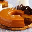 - صبّي خليط الكريم كراميل الدافئ فوق طبقة الكيك البارد.