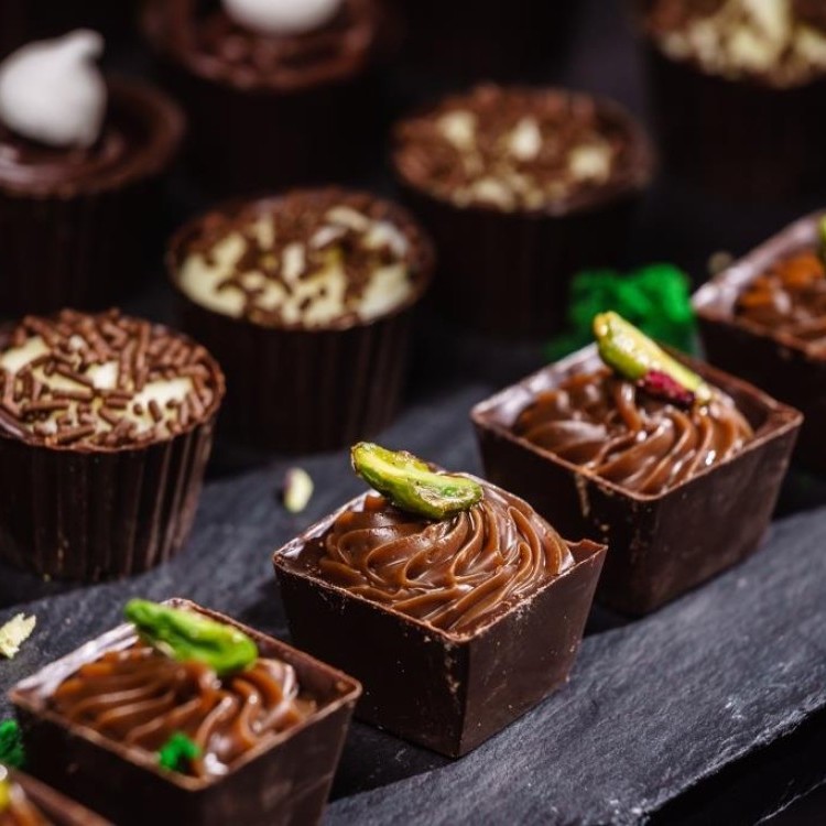 مربعات الشوكولاتة (Chocolate Cups أو Chocolate Boxes)، وهي عبارة عن قوالب شوكولاتة صغيرة على شكل مكعبات مفتوحة من الأعلى. محشوة بكريمة شوكولاتة مخفوقة (غاناش أو موس شوكولاتة) مصبوبة بخطوط حلزونية جميلة، مزينة بقطع صغيرة من الفستق المطحون أو شريحة فاكهة مجففة (مثل الليمون أو الكيوي) توضع في الأعلى، وبعض القطع مزيّنة بورق نعناع صغير لإضفاء لون أخضر منعش.