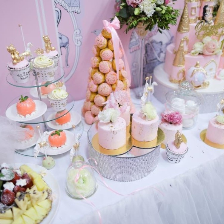 برج الماكرون الوردي: مكون من كرات ماكرون وردية مرصوصة بشكل هرمي، ومربوطة من الأعلى بشريط ساتان زهري، يوضع في المنتصف كقطعة ديكور أساسية، أما الكعكة الكبيرة متعددة الطبقات فضعيها (خلف البرج قليلاً).