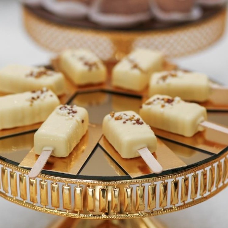 هي حلويات صغيرة على شكل «ميني بوبسكل/كعكات بعصي» موضوعة على طبق تقديم دائري ذهبي مع سطح مرآة، تحت كل قطعة هناك قاعدة صغيرة ذهبية (بطاقات/ ألواح تقديم مستطيلة رفيعة) مُرتّبة كأشعة الشمس حول المركز.