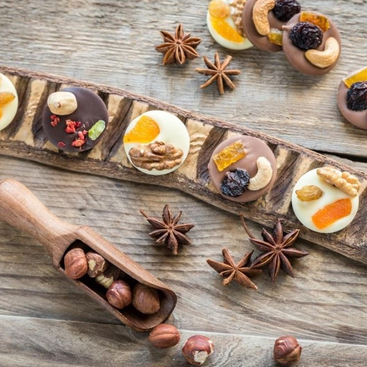 إضاءة دافئة خافتة، فهي مثالية لإبراز اللمعة الذهبية للفواكة المجففة واللمعان الغني للشوكولاتة.