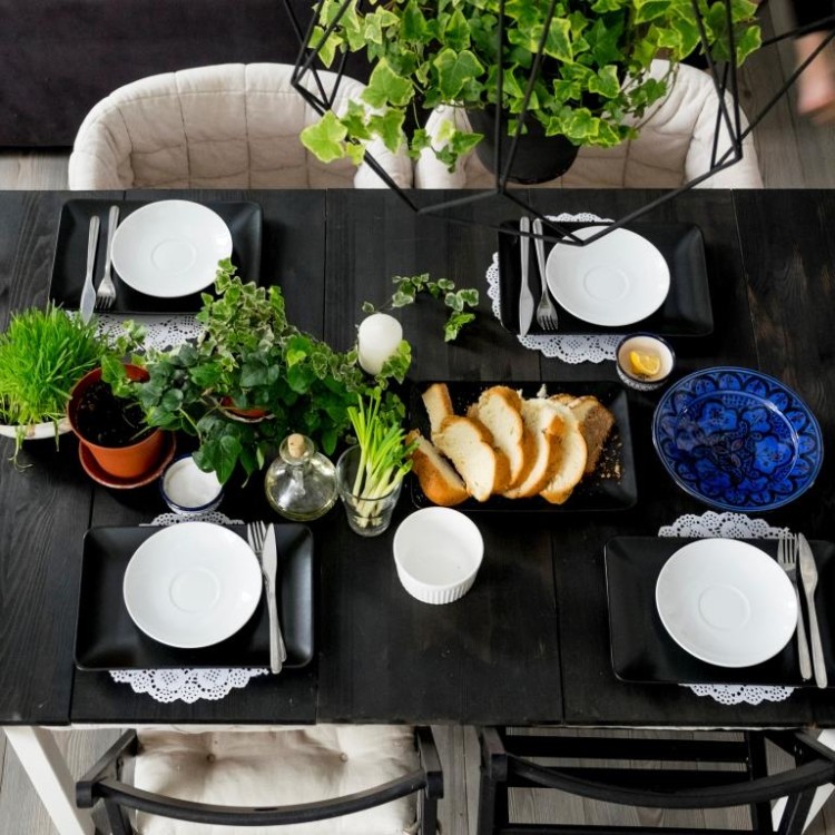 يمكنك اللجوء إلى التنسيق العصري، بملامح طبيعي وأنيقة يجمع بين اللونين الأسود والأخضر، مع لمسة من الخشب والنباتات الحية. واتبعي بذلك أسلوب المائدة هو حديث (Modern) بلمسة طبيعية (Green Rustic Touch). والهدف من التنسيق هو الدمج بين الفخامة العصرية والدفء الطبيعي للنباتات، لتكون مثالية لفطور أو غداء بسيط في المنزل أو في الحديقة.