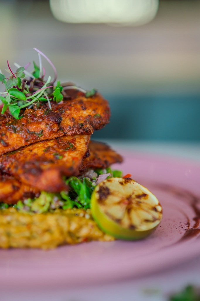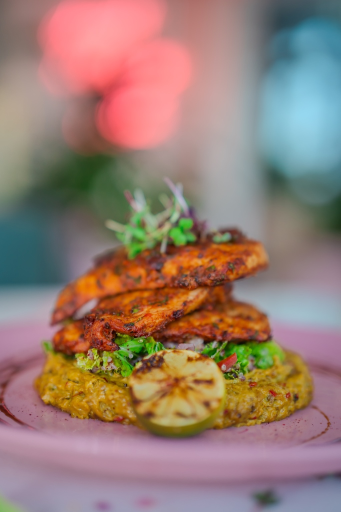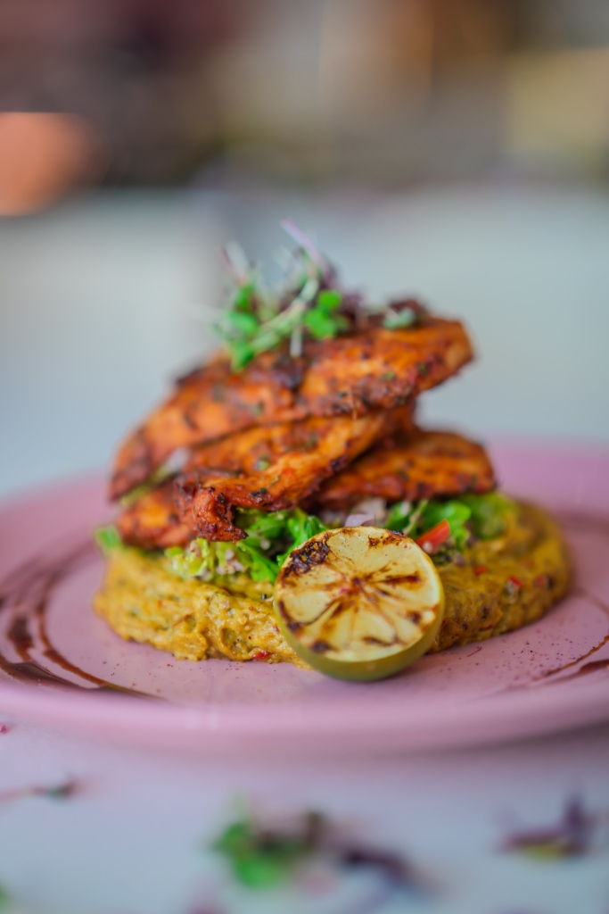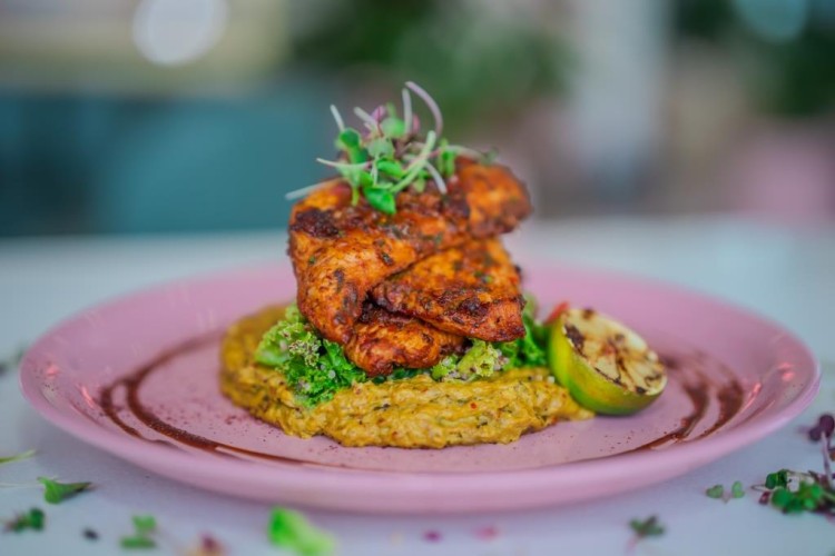 - ضعي الدجاج المشوي فوقها، ثم وزّعي دبس الرمان حول الطبق، ورشّي مسحوق السماق، وزيّني الطبق بالليمون المشوي والأعشاب الصغيرة.