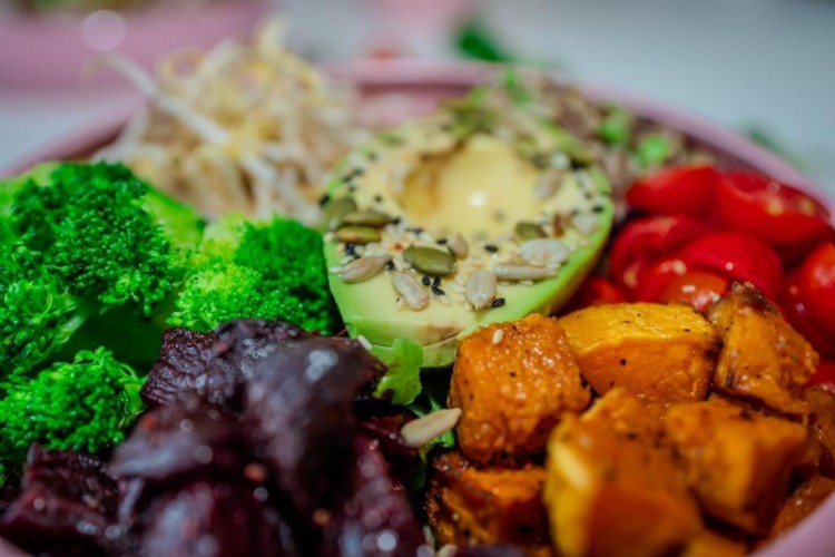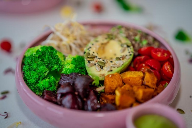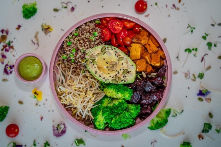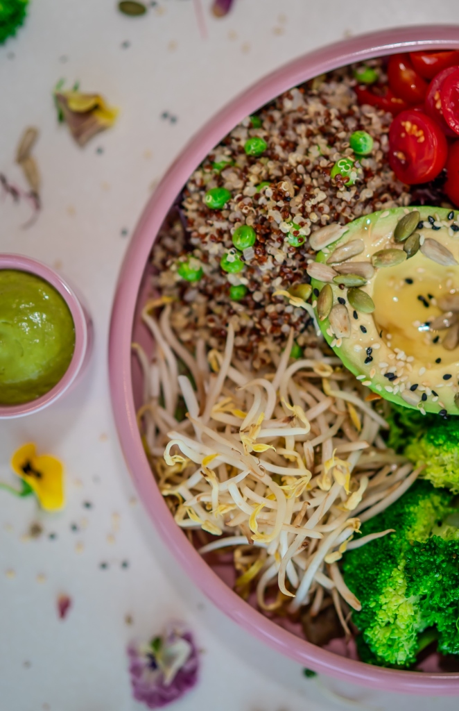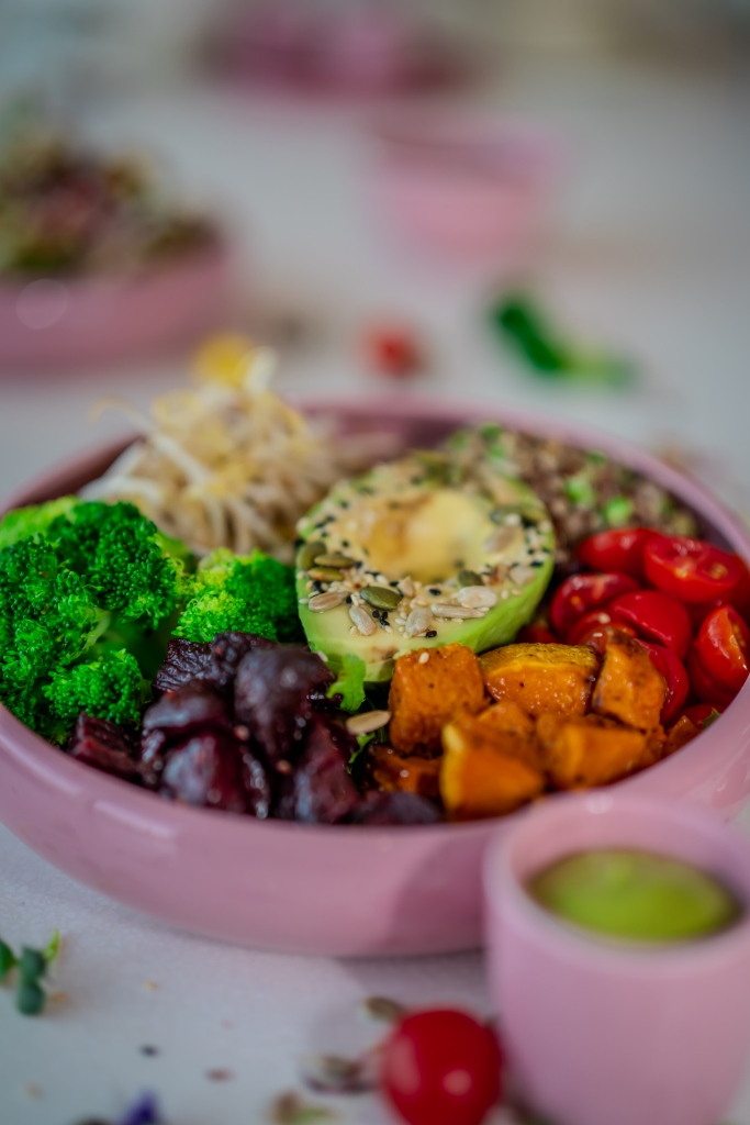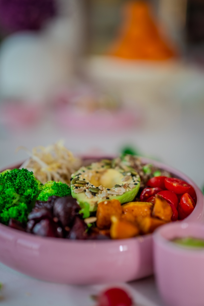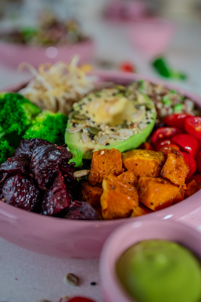- في وعاء سلطة كبير، رتّبي الشمندر المشوي، واليقطين المشوي، والطماطم الكرزية المتبلة، والبروكلي المسلوق، وخليط الكينوا والبازيلاء الخضراء جنباً إلى جنب، ثم ضعي نصف حبة الأفوكادو المتبلة في وسط الوعاء، وقدّمي الطبق مع صلصة الخضروات الخضراء على الجانب.