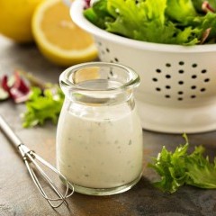 - في وعاء، اخلطي المايونيز مع الزبادي، عصير الليمون، الثوم، البارميزان، الخردل، الملح، والفلفل حتى تحصلي على صوص ناعم.