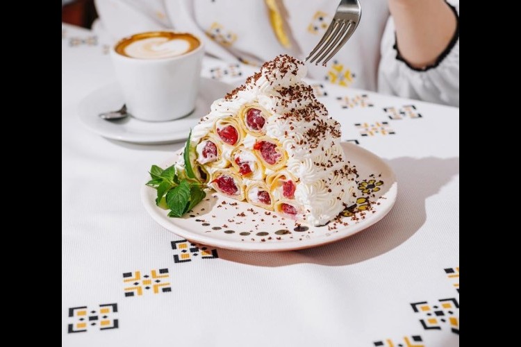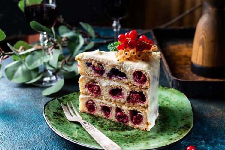 كيك الكرزة الروسي ... يُصنع هذا الطبق من رولات كريب محشية بالكرز تُرتّب على شكل هرم وتُغلف بالكريمة المخفوقة، وأحياناً يُسمى كيكة أصابع الكرز.