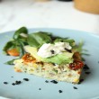 - رشي الجبن المبشور على الوجه، ثم غطي المقلاة، واتركي الفطيرة تطهى لمدة 5-7 دقائق حتى ينضج البيض ويذوب الجبن، ثم قدميها ساخنة.