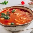 - اطهي الرافيولي حسب التعليمات على العبوة، ثم قومي بتوزّيعه على صحون عميقة، ثم اسكبي الشوربة فيها، وزيّنيها بأعواد الزعتر، وقدّميها مع الخبز.