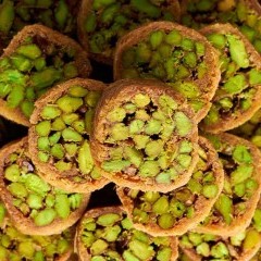 - اخلطي الفستق الحلبي مع السكر، وأضيفي القطر الخفيف فقط لتتماسك الحشوة ثم أضيفي ماء الزهر.