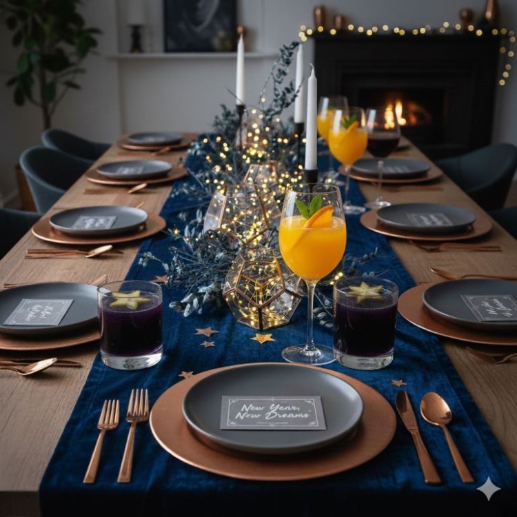 تُظهر هذه الصورة مائدة عشاء مُعدة للاحتفال بليلة رأس السنة بأسلوب عصري وفاخر يجمع بين الألوان الداكنة ولمسة النحاس الدافئة.