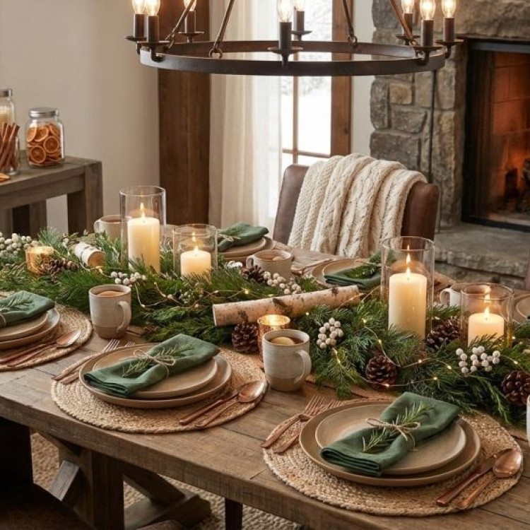 تغطي الزينة معظم طول الطاولة، وهي مزيج من العناصر الشتوية والطبيعية. تتكون من أغصان صنوبر خضراء وكثيفة متدلية قليلاً، تتخللها ثمار التوت الأبيض وأكواز الصنوبر الطبيعية. وتنتشر شموع عمودية بيضاء سميكة بأحجام مختلفة داخل حوامل زجاجية شفافة طويلة، مما يضيف ارتفاعاً وإضاءة هادئة، حيث تُستخدم قطع من خشب البتولا الطبيعي على شكل جذوع صغيرة كعناصر زخرفية، فيما تنتشر سلاسل رفيعة من الأضواء الصغيرة الدافئة بين الأغصان، مما يعطي إحساساً متلألئاً.