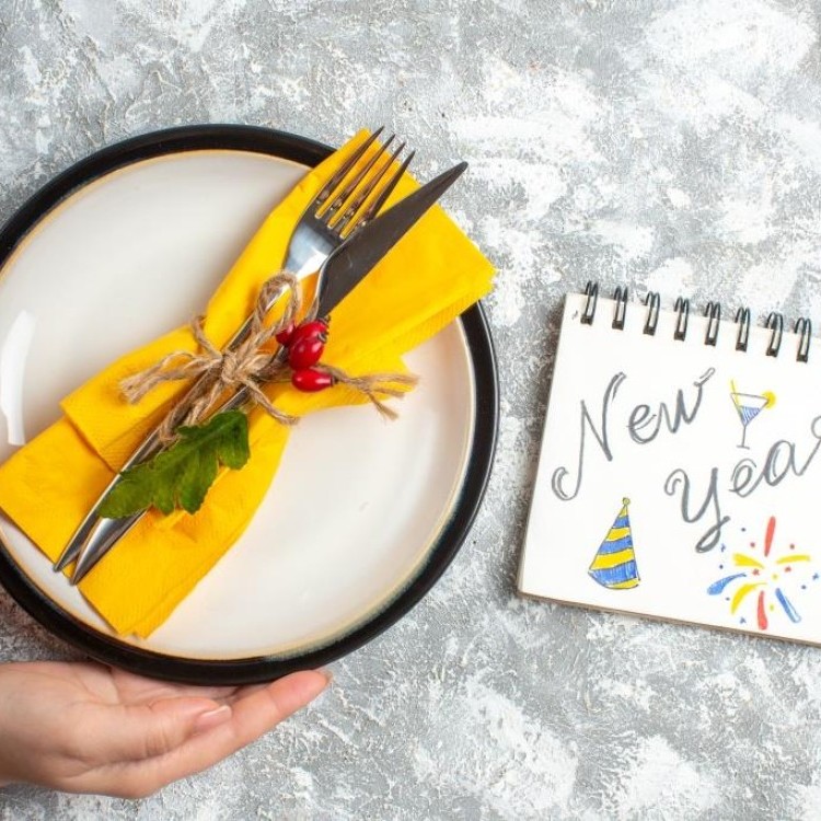الدفتر الاحتفالي: على الجانب الأيمن من الطبق، يوجد دفتر ملاحظات صغير ذو غلاف حلزوني؛ كُتبت عليه عبارة "New Year!" بخط يد ملون، وتُزينها رسومات بسيطة ومبهجة ترمز لرأس السنة: رسم لكأس عصير، قبعة حفلات زرقاء، ألعاب نارية ملونة، وبالونات (أصفر، أحمر، أخضر، وأزرق). يمكنك وضع دفتر صغير لكل ضيف ليدوّن ملاحظاته، التي يجب تقبلها بكل رحابة صدر، أو يمكنه تدوين أمانيه للسنة الجديدة.