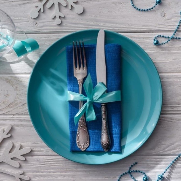 يوجد في مركز الصورة طبق طعام مستدير بلون أزرق فيروزي زاهٍ موضوع فوق خلفية بيضاء خشبية، وفوق الطبق، يوجد منديل قماشي مطويٌّ بلون أزرق داكن أو كحلي. وفوق المنديل، وُضعت شوكة وسكين بأسلوب عتيق أو فضي، حيث الشوكة على اليسار والسكين على اليمين. ورُبطت الشوكة والسكين والمنديل معاً بشريط أزرق فيروزي فاتح/ مائي على شكل عقدة أنيقة.