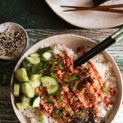 3. وزعي الصلصة فوق المكونات بطبق التقديم، وقلبي جيداً حتى تتداخل مع بعضها.