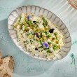 - ضعي حلقة تشكيل معدنية (Ring Mold) في منتصف الطبق، واملئيها بالسلطة واضغطي بخفة لتتماسك، ثم ارفعي الحلقة ببطء، وزيّني السطح بـ: صفار بيض مبشور على الحواف، وورقة بقدونس في الأعلى.