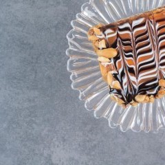 - رتّبي شرائح الصامولي المحمّصة في الصينية أو طبق التقديم، واسكبي فوقها جزءاً من الخليط الكريمي.