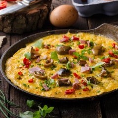 - في مقلاة على النار سخني الزيت، ثم أضيفي مزيج البيض واتركيه لدقيقة على نار عالية، ثم خففي النار لمدة 5 دقائق.