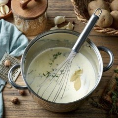 - صبي الحليب تدريجياً مع التحريك المستمر لتجنب التكتلات.