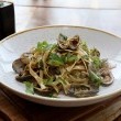 3.  ضعي فوق المعكرونة الجرجير وشرائح المانجو والمحار والبصل، وتبلي بالملح والفلفل، وقلبي.
