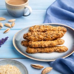 - حضري صينية فرن وغلفيها بورق الزبدة ثم خذي كل قطعة واغمسيها في طبق السمسم المحمص ثم ضعيها في الصينية، وكرري هذه الخطوة حتى نفاد كل كمية العجين.