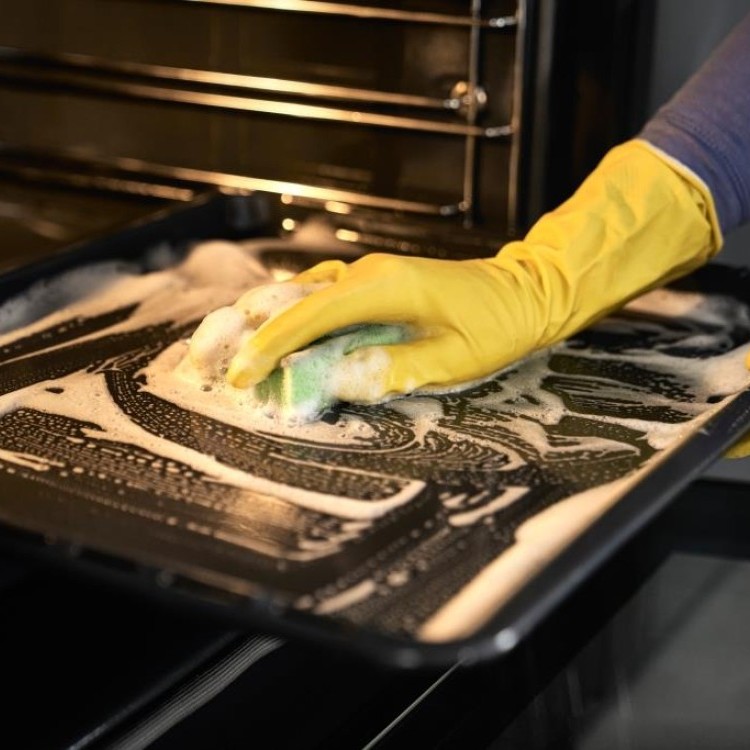 - انقعي صواني الفرن في ماء ساخن وصابون مباشرة بعد الاستخدام، لكن احرصي على عدم حرق يديك.