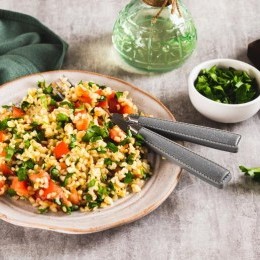 سلطة التبولة بالبرغل والطماطم والبقدونس ... برغل التبولة هو برغل ناعم (أبيض أو أسمر) يُنقع في عصير الليمون أو الماء الساخن لمدة 15-30 دقيقة ليصبح طرياً، ويُشكل المكون الأساسي لامتصاص النكهات في سلطة التبولة. يُضاف عادة بمقدار نصف كوب إلى كوب ونصف إلى البقدونس، النعناع، والطماطم، ليعطي قواماً متميزاً ونكهة غنية. حضري ألذ وصفات مقبلات رمضان على سفرتك من مطبخ سيدتي.