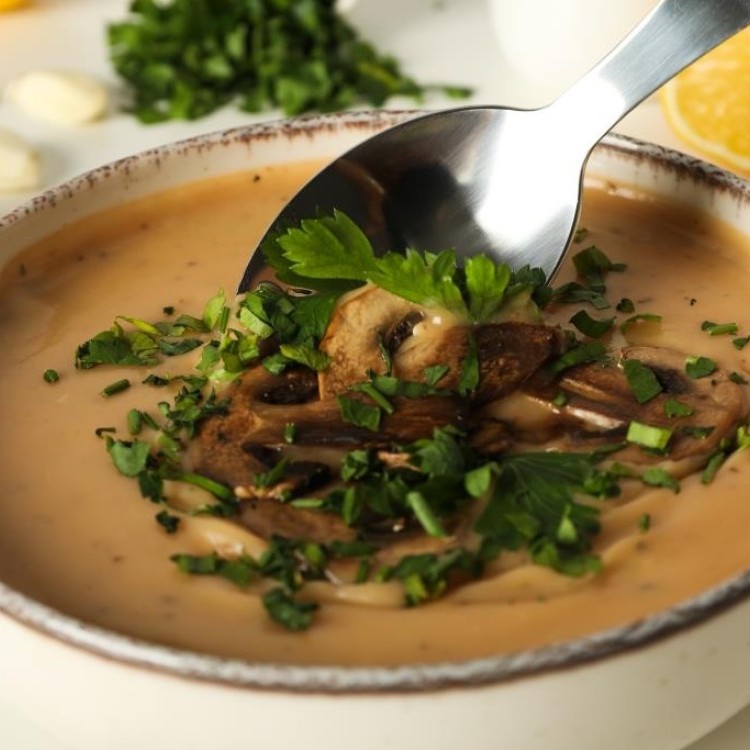 شوربة الفطر بالكريمة والثوم المحمّر وزيت الزعتر