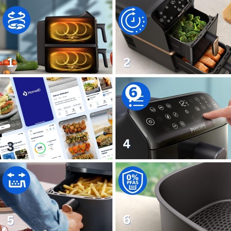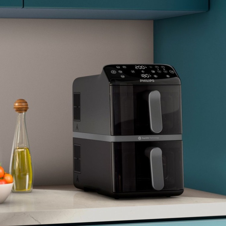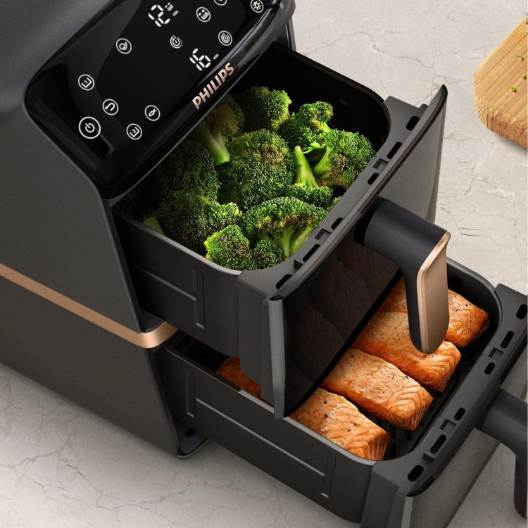 تمنحك مقلاة الهوائية ذات السلة المزدوجة من فيليبس ضعف سعة الطهي بتصميم مدمج، إذ تتيح لك السلّتان سعة 5 لترات تحضير وجبتين كاملتين في وقت واحد مع توفير 45% من مساحة سطح المطبخ.