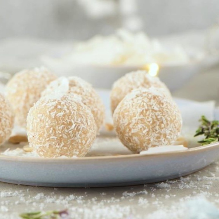 طريقة الفكرة: يُخلط جوز الهند مع الحليب المكثف المحلى، وتُشكّل كرات صغيرة تُحشى بكريمة الفستق، ثم تُغمس في جوز الهند أو الشوكولاتة.