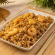 - يُضاف الجمبري المقلي فوق مزيج الأرز والبيض، وتقلب المكونات بتأنٍ.