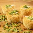 - تُقطع عجينة الكنافة قطعاً صغيرة.