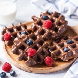 وافل الشوكولاتة ... إذا كنت من عشاق الحلويات الغنية والمليئة بالطاقة، فلا شيء يُضاهي مذاق وافل الشوكولاتة الطري والذهبي مع قلبه المليء بالشوكولاتة اللذيذة. استمتعي بتجربة ساحرة تجمع بين قرمشة الخارج ونعومة الداخل.