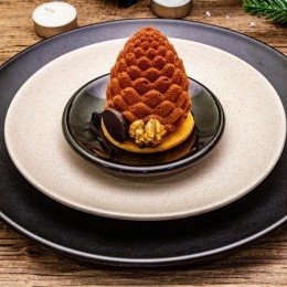 موس الشوكولاتة الصنوبرية المخملي ... بالمظهر المخروطي (Pinecone Chocolate Mousse Dessert)، وهي حلوى فاخرة تُقدّم في المطاعم الراقية، تتكوّن عادةً من موس الشوكولاتة أو الكراميل المملّح مُشكَّل في قالب على شكل ثمرة صنوبر، ومغطّى برذاذ مخملي (velvet spray) مع قاعدة من الشوكولاتة وقطع جوز للزينة.