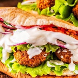 ساندويش الفلافل مع صوص الطحينة ... يعد ساندويش الفلافل الخيار المثالي لعشاق المأكولات الشرقية، فهو يجمع بين قرمشة أقراص الفلافل الساخنة والخضار الطازجة، مع صلصة الطحينة داخل الخبز العربي الدافئ واللذيذ.