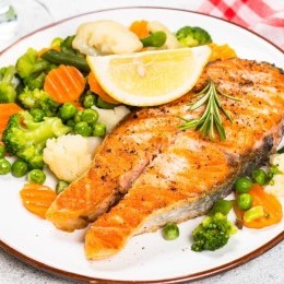 سلمون مشوي مع خضار سوتيه للرجيم ... يعتبر طبق سمك السلمون المشوي مع الخضار، من الوصفات الشهية والخفيفة والغنية بالفوائد، مع تشكيلة من بالخضار، وصفة رائعة وطيبة لرجيمك المثالي.