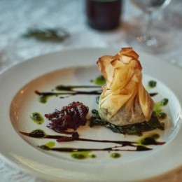 باستري فيلو محشو ... (Phyllo Pastry Parcel) أو ما يُعرف أحياناً باسم "كيس العجين الذهبي"، هو طبق راق من المطبخ الأوروبي، وهو عبارة عن عجينة فيلو (جلاش) محشوة بخليط من الجبن أو الخضار أو اللحم، تُخبز حتى تصبح ذهبية وهشة، وتُقدّم غالباً مع صلصة بلسميك مخففة ومربى بصل أو تين للتزيين.